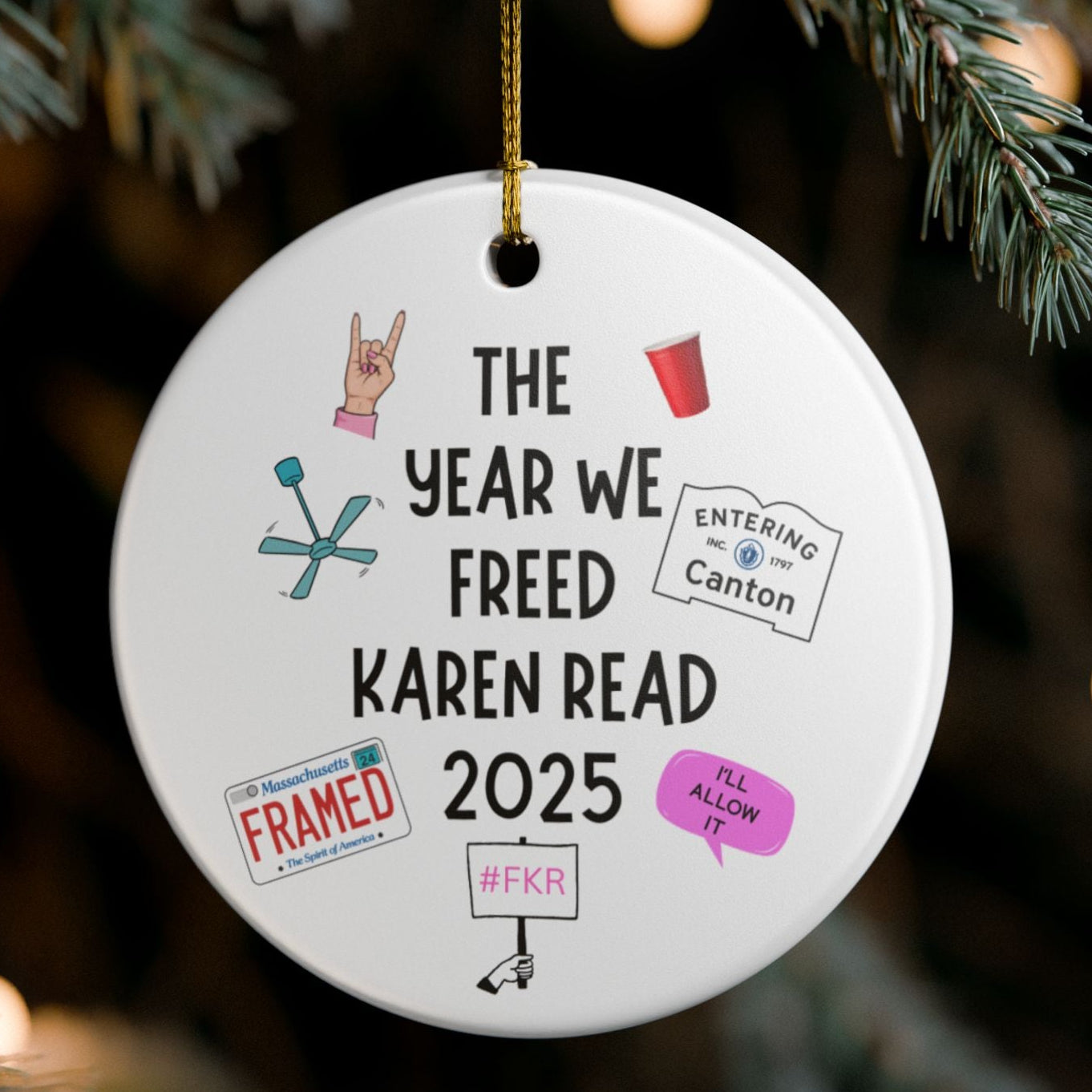 Celebrate a hard-won moment with a cheeky, conversation-starting ceramic ornament. Smooth white ceramic holds a glossy face with matte-printed icons and bold text: “The Year We Freed Karen Read 2025.” Playful stickers — a red cup, pink speech bubble, protest sign, and tiny license/‘framed’ stamps — circle the phrase, giving this piece a scrapbook-like charm. Hung from the included gold string, it adds personality to a tree branch, a mantel hook, or a dorm room display. The compact round shape and durable ceramic make it a keepsake that catches the eye and sparks stories for years to come.